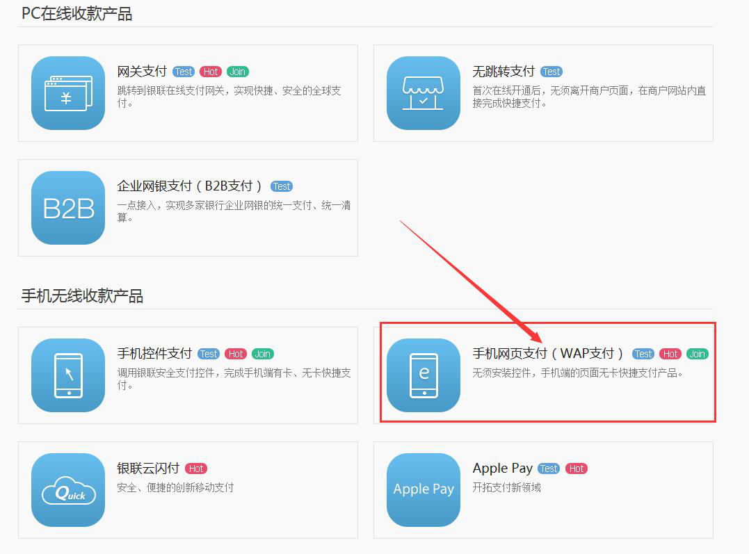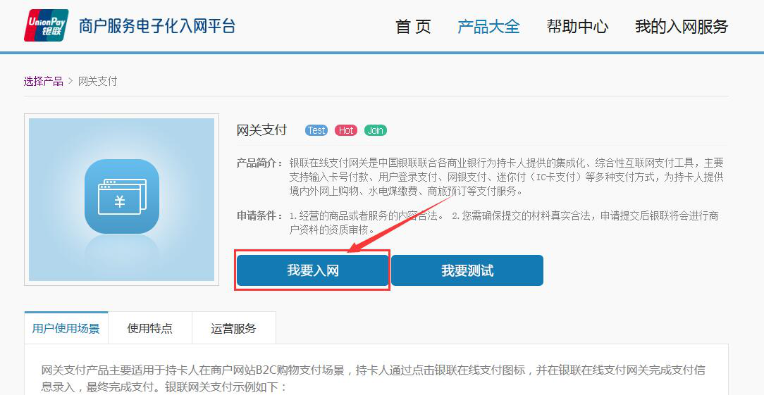 2、注册并登录商户账号,进入产品大全,选择对应的产品,发起我要入网的审核流程。如果只需要PC端网页支付的,申请网关支付即可。如果需要在移动端网页支付的,申请手机网页支付(WAP支付).
