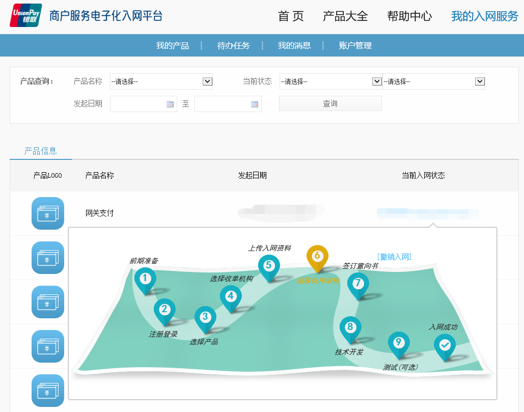3、申请好以后,可以在“我的入网服务”中,查看和管理申请进度,成功之后进入商家服务平台进行管理