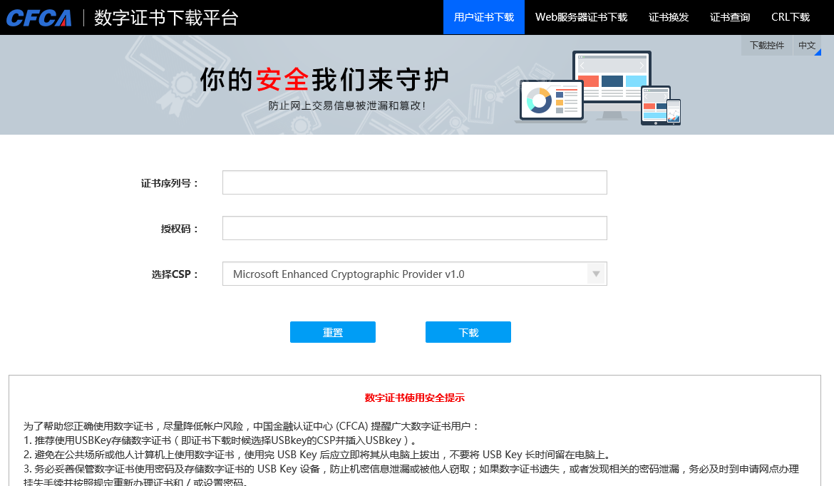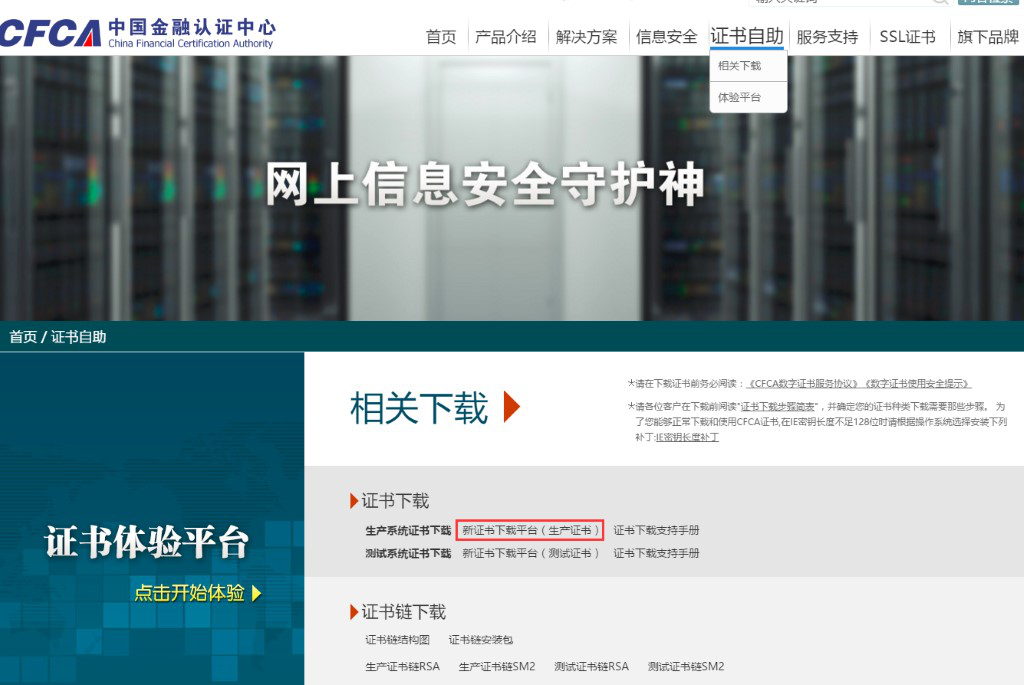 1、进入中国金融认证中心:http://www.cfca.com.cn/,找到“证书下载”,点击下载;