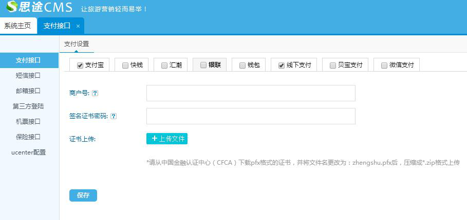 4、进入思途CMS后台上传证书并填写商户号及证书密码完成配置,证书上传路径:/thirdpay/yinlian/certs目录下,文件名称为zhengshu.pfx