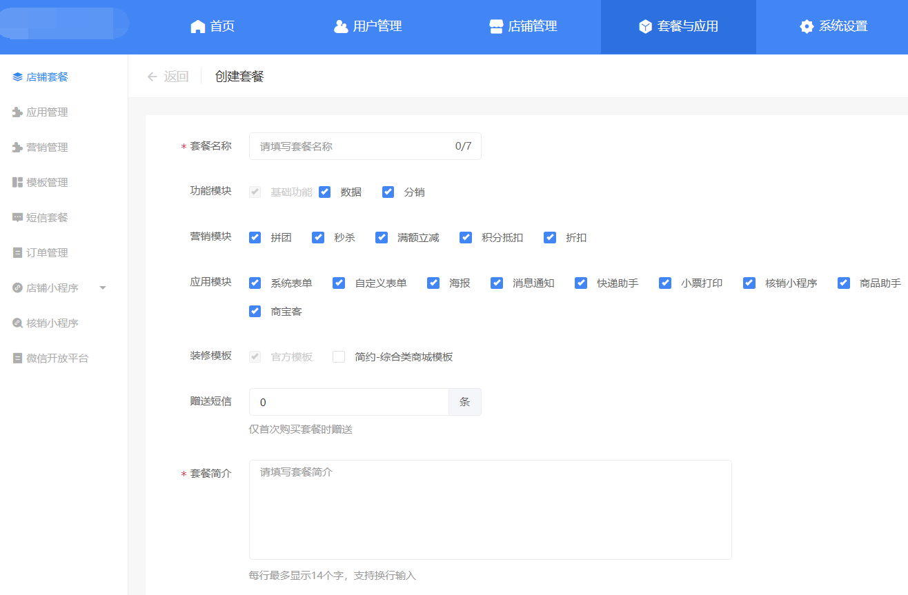 套餐与应用此功能是给管理端设置售卖相应的店铺套餐、短信套餐,设置编辑首页模板信息以及是否收费,统计查看已售出的订单信息,以及小程序上传代码、对接核销小程序和微信开放平台参数设置。