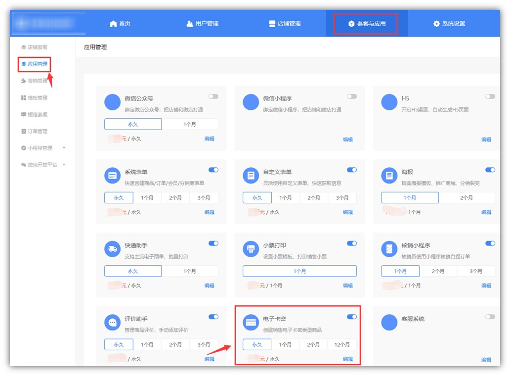 1、在使用电子卡密之前需要在EWEISHOP的管理端进行【电子卡密】应用的购买和启用哦,点击【套餐与应用】-【应用管理】,如果未购买或已到期时,点击此处进行购买续费哦。