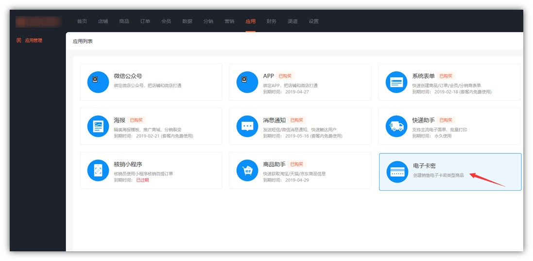 2、已购买后,登录新尾商城的业务端,点击【应用】-【应用管理】,选择电子卡密,即可进入电子卡密操作页面了;