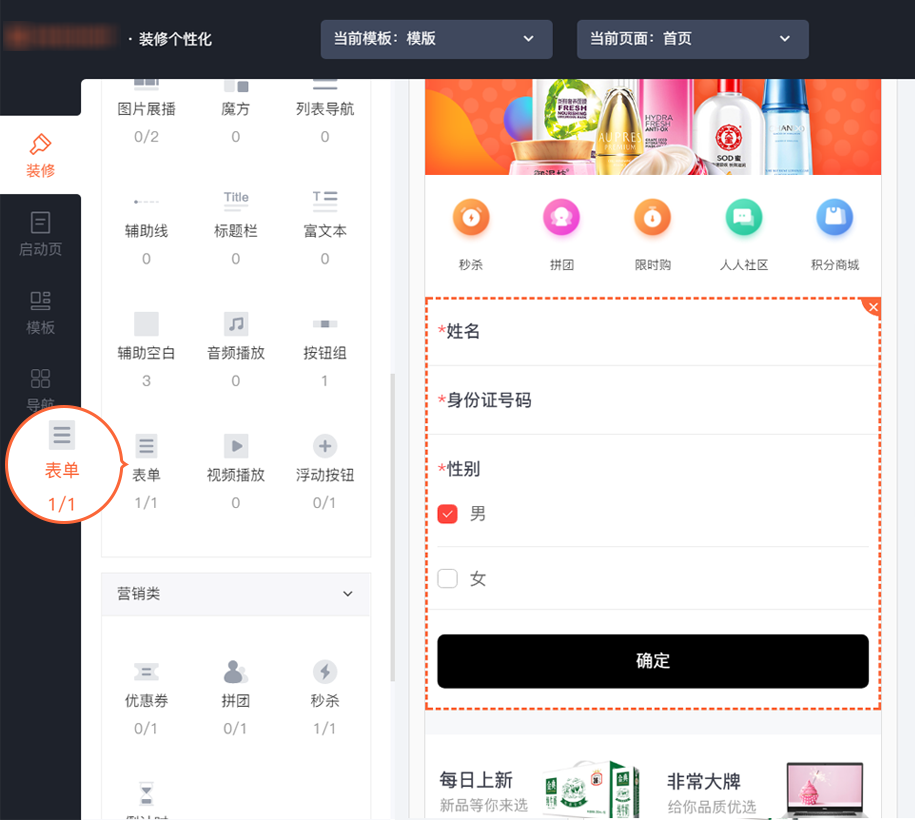 第一种自行设计添加表单,业务端商家自己添加需要收集会员的信息,见下图: