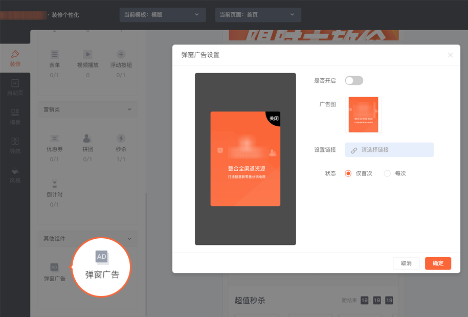 每次显示规则:每次显示的规则不同于首次显示规则,会员进入商城的时候显示广告,在点击底部导航或者是进入其他页面,会员再次点击首页的时候,弹窗广告会再次显示,也就是只要会员通过商城的其他页面再次点击首页都会显示弹窗广告页的信息。