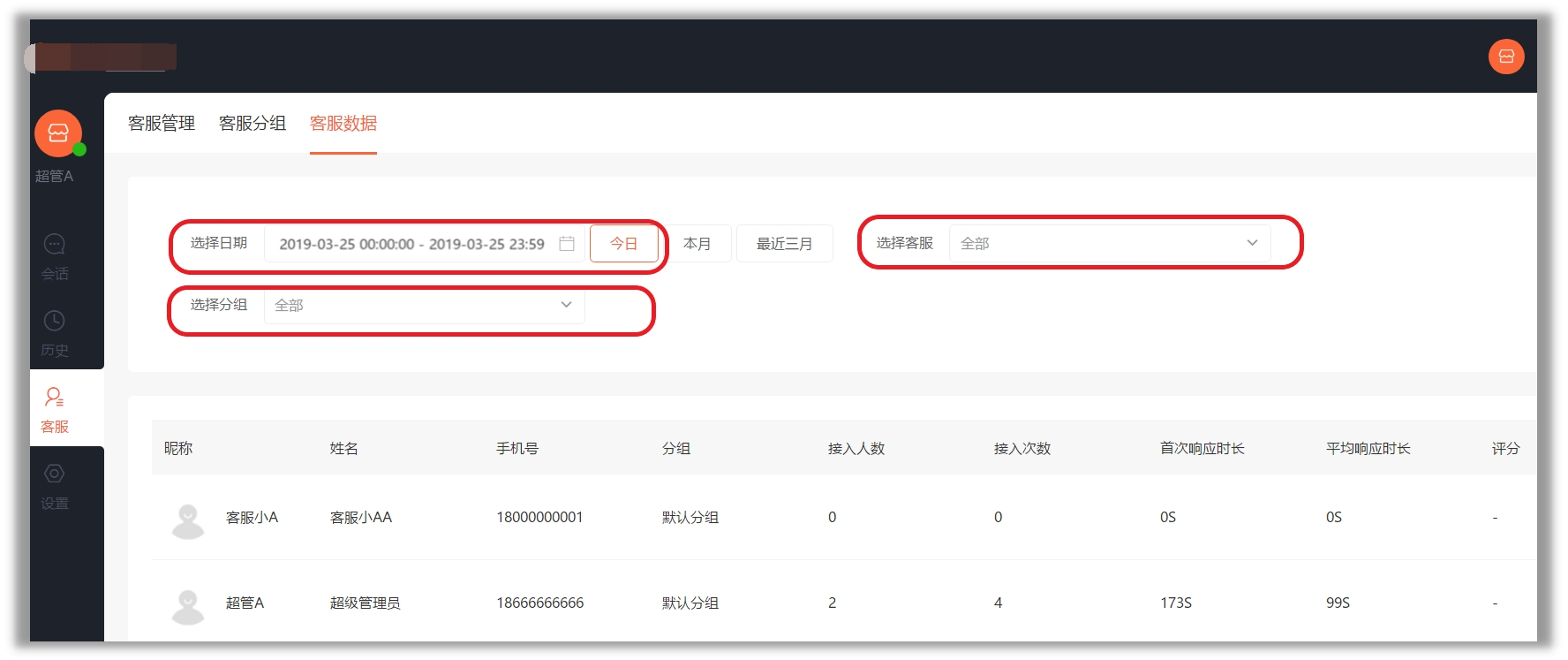 1.选择日期:可根据日期查看客服数据,默认选择今日。