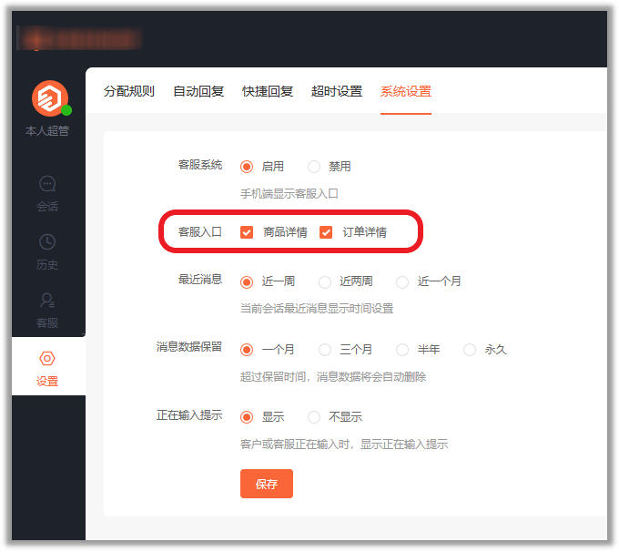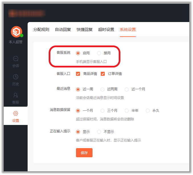 第一步,我们可以在管理端后台系统设置进行手机端入口的开启。不开启的话无法在客服入口中找到客服