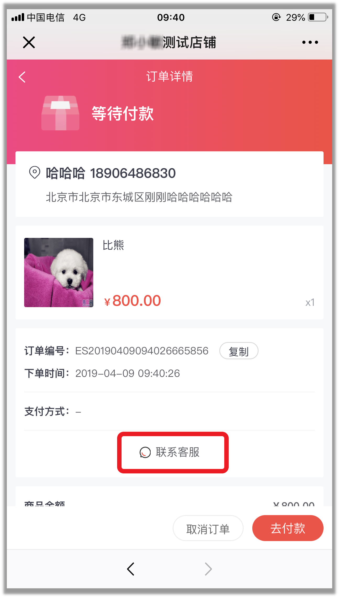 2、勾选客服入口后,手机端订单详情的客服入口展示如下图: