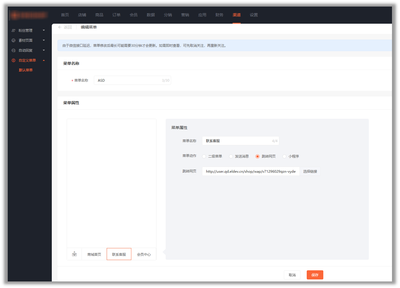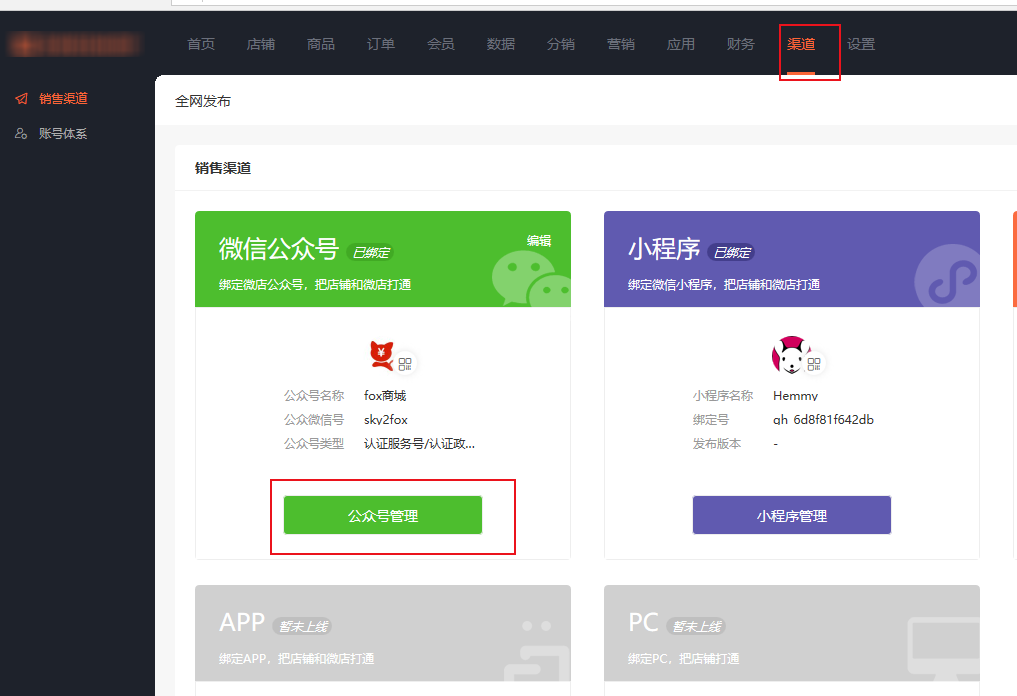 1、登录新尾商城管理端后台,选择【渠道】——微信公众号管理