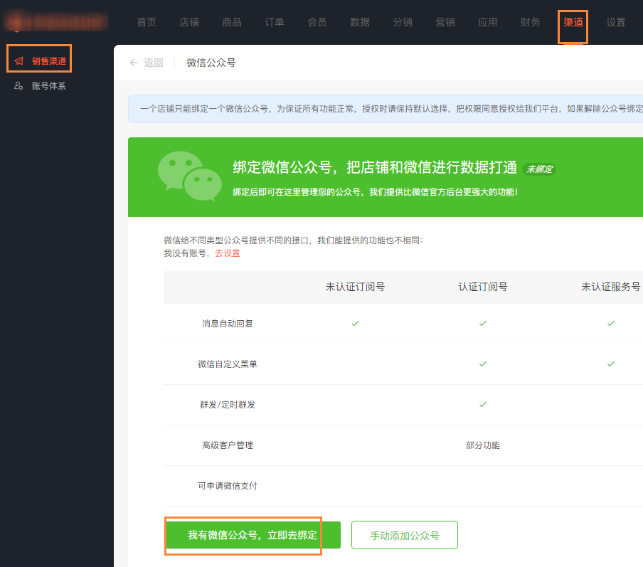 对接绑定公众号是有两种方式:已有公众号扫码授权绑定、手动添加公众号