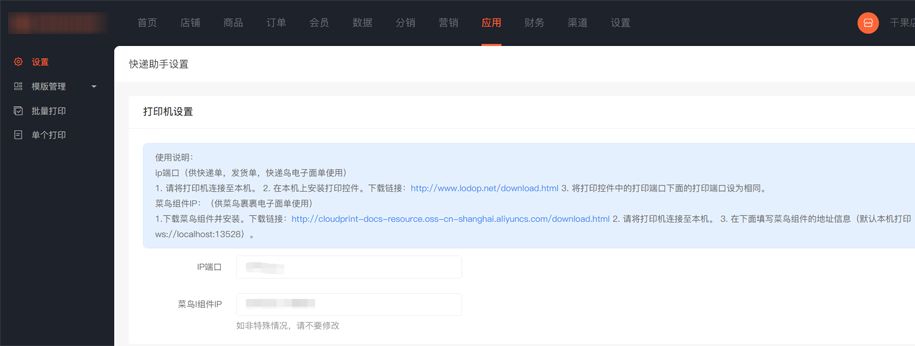 上图中的菜鸟组件IP,系统默认显示的就是本机IP地址,是使用对接电子面选择菜鸟的时候下载填写的,只需要将菜鸟的组件下载安装到电脑上即可,菜鸟组件IP建议不要随意修改哦。