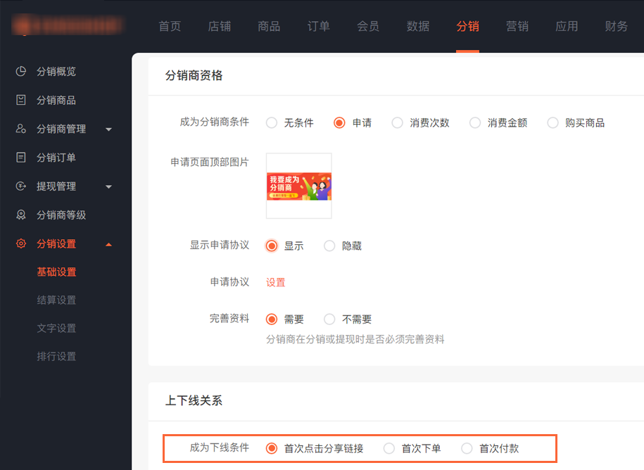 成为下线的条件有首次点击分享链接、首次下单和首次付款3种,符合设置的条件即可绑定上下线关系。